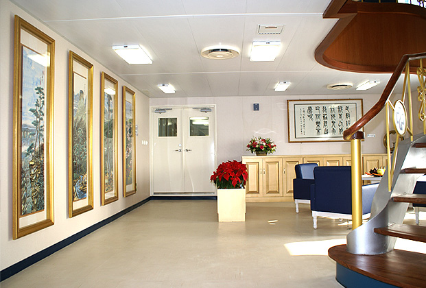 The saloon, galleries and rooms aboard the vessel are decorated with copper sculptures, large-scale calligraphy works, various kinds of works of art, and photographs taken by employees of CSC Group.